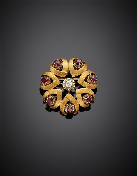Spilla in oro giallo e bianco in parte satinato con rubini e diamante al centro, g 9,70 circa, diam. cm 2,70 circa. Marcata 543 MI.