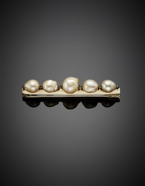 Spilla in oro bianco con cinque perle irregolari, g 9,96 circa, lungh. cm 5,70 circa.