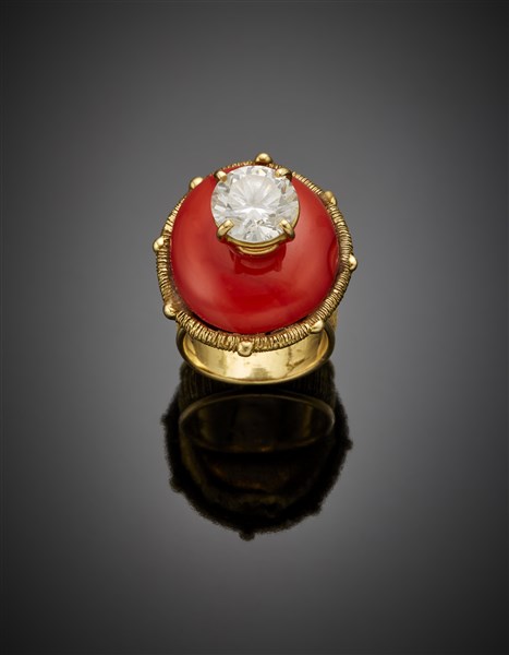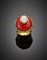 Anello in oro giallo, pietra incolore e pasta vitrea ad imitare il corallo, g 19,09 circa misura 13/53.