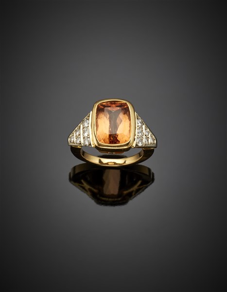 Lot 1246 | Anello in oro giallo con topazio arancione a cuscino e diamanti, dettagli in or