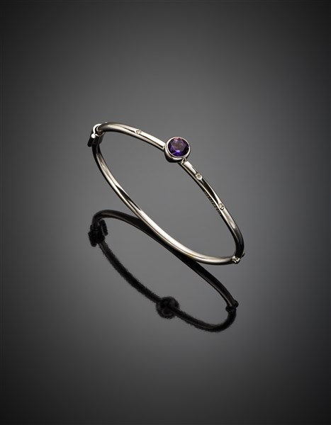 Bracciale rigido apribile in oro bianco con ametista e diamanti, g 20,66 circa, diam. cm 6 circa. Firmato e marcato Manfredi, 1968 MI.