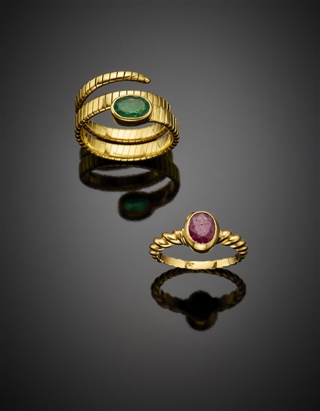 Lotto in oro giallo composto da un anello tubogas a serpente rifinito con uno smeraldo e da un anello con un rubino, complessivi g 13,81 circa misura 14/54, 18/58. (lievi difetti)