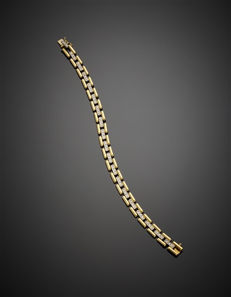 Bracciale modulare in oro giallo e bianco rifinito con diamanti, g 24,81 circa, lungh. cm 18,80 circa. Firmato e marcato Chiampesan, 294 VI.