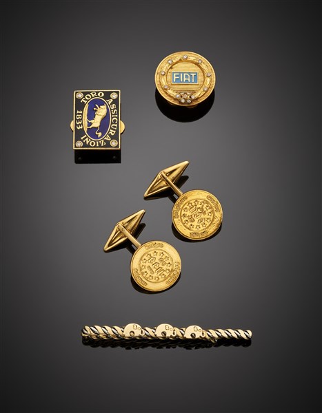 Yellow gold lot comprising two pins, a pair of cufflinks and a tie clip, small diamond and enamel accenting, metal details, in all g 23.65 circa.