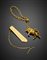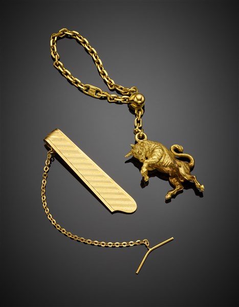 Lotto in oro giallo composto da un portachiavi a catena con pendente a guisa di toro di cm 14,70 circa e un fermacravatta di cm 4,2 circa, complessivi g 23,15 circa. Il portachiavi marcato 202 TO, il fermacravatta 212 AL.