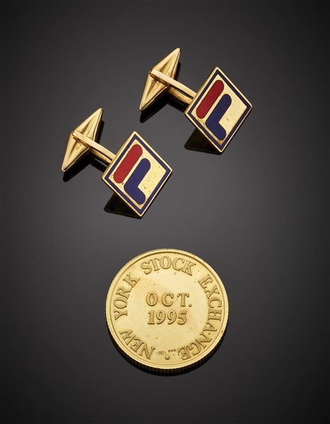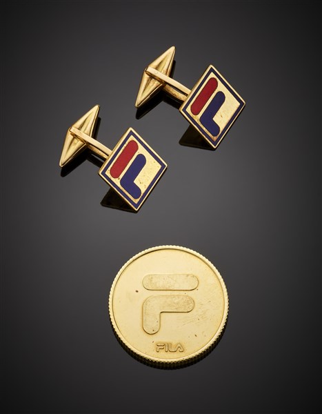 Yellow gold lot comprising a celebrative FILA medal in original case and a pair of enamel accented FILA cufflinks, in all g 29.52 circa. Medal marked 360 MI.