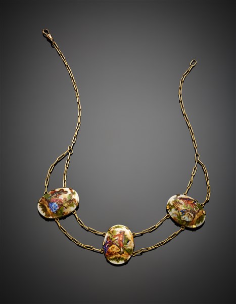 Lot 1284 | Collier a catena in oro giallo 333/1000 con tre miniature in smalti, g 27,58 ci