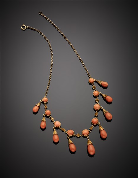 Collier in oro giallo 333/1000 rifinito al centro con nove pendenti a scalare in corallo rosa/arancione cabochon e a goccia, g 23,79 circa, lungh. cm 39,40 circa. (lievi difetti)