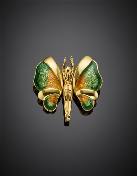 Broche a guisa di fata con ali di farfalla in oro giallo e smalti, g 20,58 circa, lungh. cm 3,60 circa.