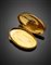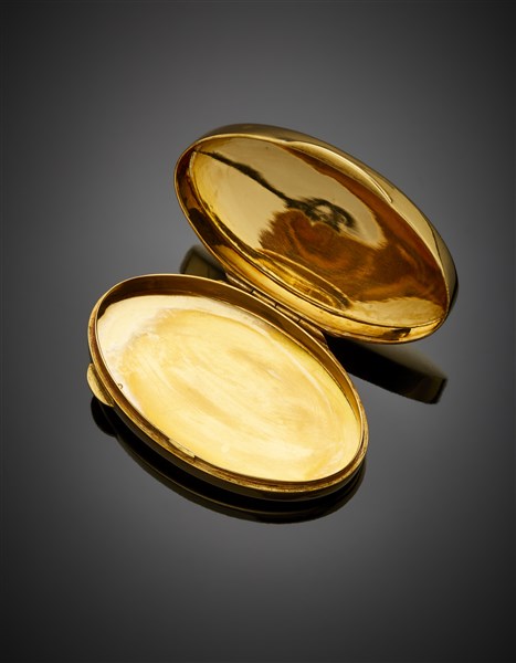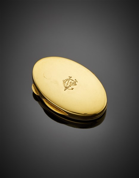 Scatolina portapillole ovale in oro giallo, le lettere "CV" sul coperchio, g 27,18 circa, largh. cm 5,20 circa. (lievi difetti)