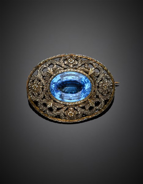 Spilla in oro e argento traforata rifinita al centro con zaffiro sintetico ovale di ct. 18,70 circa, g 13,47 circa, largh. cm 4,2 circa. (lievi difetti)