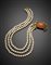Collana a tre fili di perle coltivate di mm 7.50/8.00 circa con chiusura in oro giallo a granchio con corallo pentagonale cabochon di mm 26.78 x 21.90 x 9.30 mm circa e diamanti, rubini per gli occhi, g 150,66 circa, lungh. cm 46 circa.