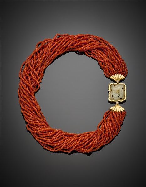 Multi-strand mm 2/2.50 circa orange coral bead necklace with carved jadeite yellow gold diamond clasp, g 109.54 circa, length cm 46.20 circa. Marked 1089 MI.