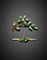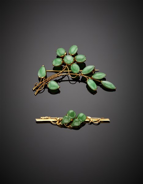 Due spille in oro giallo 333/1000 e giadeite scolpita e cabochon, largh. cm 5,5