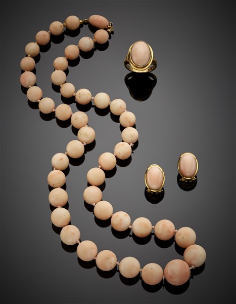 Demi parure in oro giallo e corallo rosa composta da collana a scalare di cm 56,50 circa con boules da mm 9,40 a mm 15,50 circa, orecchini a lobo con clip di cm 1.70 circa e anello misura 16/56 rifinito con piccoli diamanti, complessivi g 101,95 circa. Orecchini marcati 2416 AL. (difetti)