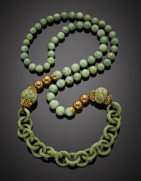 Collana lunga a boules in parte scolpite ed anelli in giadeite e quarzo microcristallino, rifinita con coppette e boule in oro giallo traforato, g 122,52 circa, lungh. cm 84 circa. (difetti)