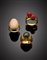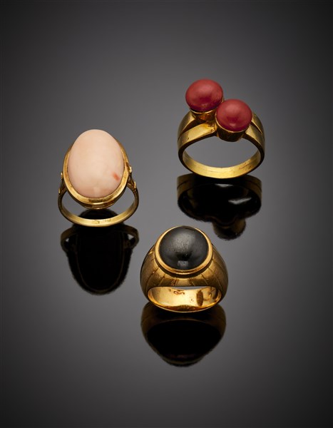 Lotto composto da tre anelli in oro giallo, due con corallo e uno con gemma con