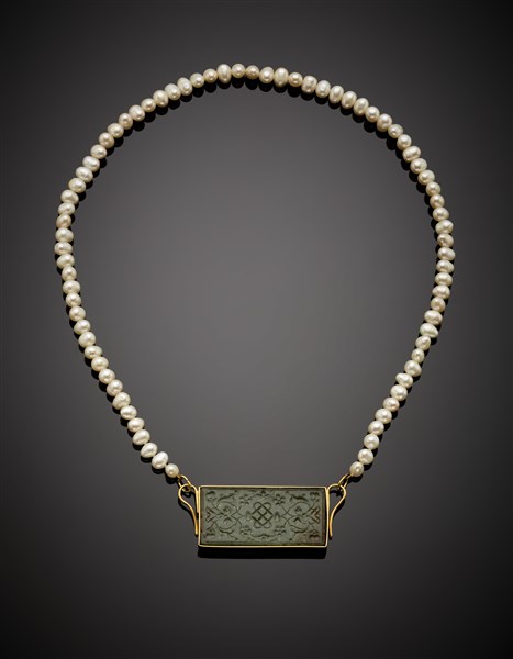Irregular mm 5.50 circa cultured pearl necklace with carved nephrite yellow gold central, g 41.09 circa, length cm 48.10 circa. (slight defects)