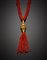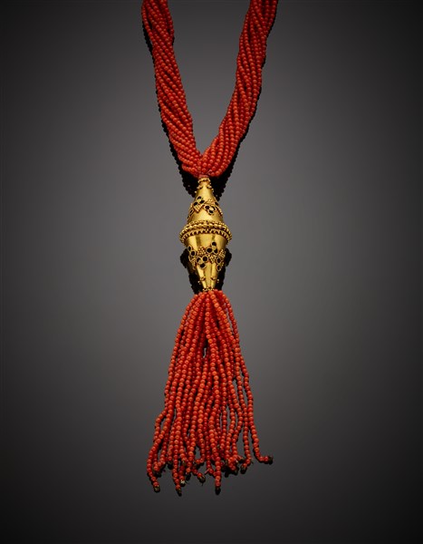 Long multi-strand orange coral bead necklace with a cm 13 circa yellow openwork gold lozenge central and coral tassel, without clasp, g 81.80 circa, length cm 82 circa.