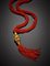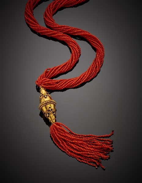 Lunga collana multifili di corallo arancione con centrale a losanga traforata in oro e rifinita con una nappa in corallo di cm 13 circa, senza chiusura, g 81,80 circa, lungh. cm 82 circa.