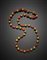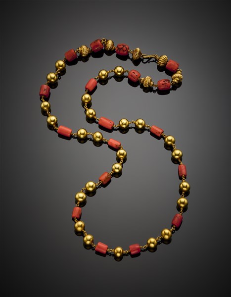 Collana in oro giallo a boule in parte scanalate e corallo rosso a barilotti, l