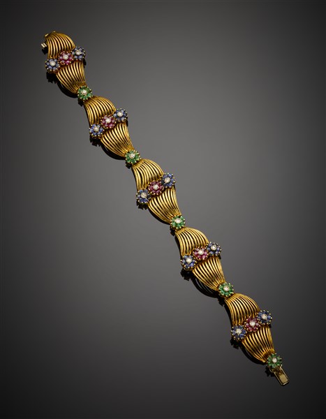 Lot 1361 | Bracciale modulare in oro giallo con fiori in diamanti, zaffiri, rubini e smera