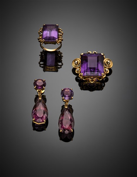 Demi parure in oro giallo e bianco con ametiste composta da anello misura 11/51 e spilla a clip di cm 2,9 circa, insieme ad orecchini pendenti simili di cm 3,80 circa, complessivi g 39,35 circa.