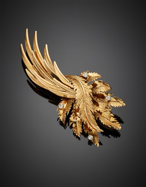 Lot 1376 | Spilla floreale in oro giallo in parte cesellato rifinita con diamanti, g 15,34