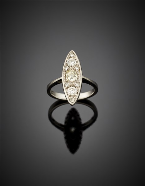 Anello a marquise in oro bianco con diamanti rotondi e old mine per complessivi ct. 0,75 circa, g 3,97 circa misura 12/52. Marcato 861 AL.