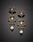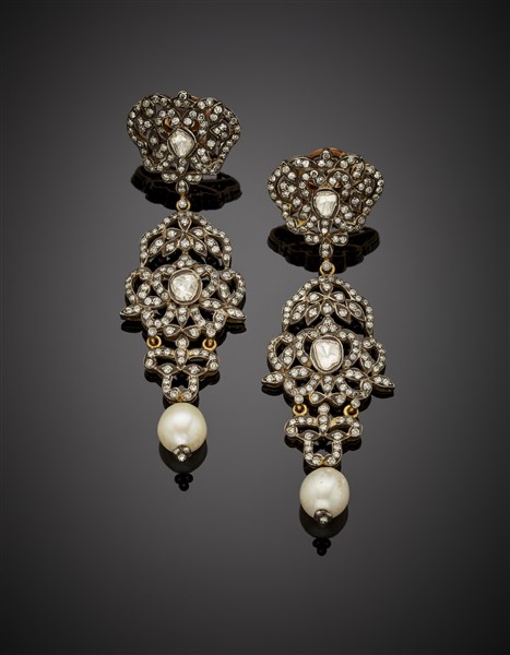 Silver and 9K gold pendant earrings set with irregular and round huit-huit diamonds holding two mm 8.75 x 10.40 circa cultured pearls, g 18.81 circa, length cm 7.70 circa.