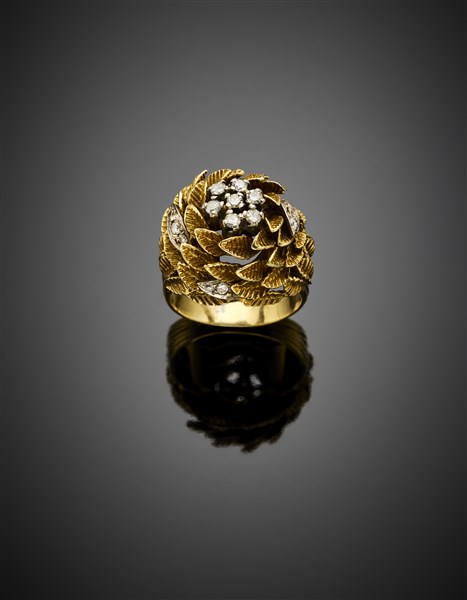 Anello in oro giallo e bianco a foglie con diamanti, g 13,95 circa misura 15/55