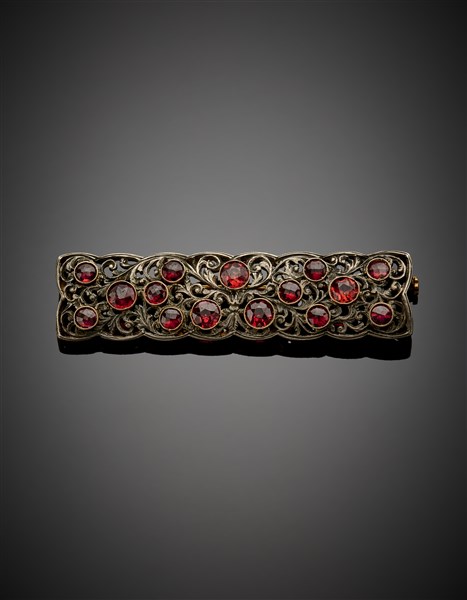 Spilla rettangolare traforata a racemi in oro rosso, argento e granati, g 8,96 circa, lungh. cm 5,40 circa.