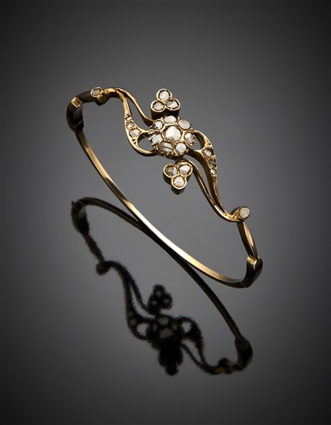 Bracciale rigido alla schiava in oro giallo 300/1000 rifinito con diamanti a mezza rosetta, g 13,51 circa, diam. cm 5,90 circa.