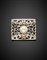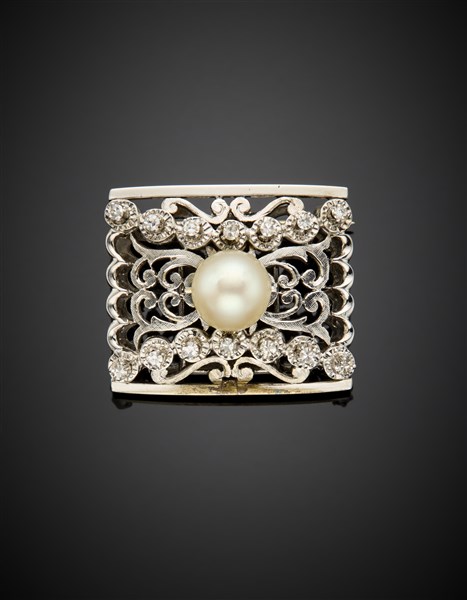 Chiusura/spilla in oro bianco, diamanti e perla di mm 8.00 circa, g 11,62 circa, largh. cm 2,50 circa.