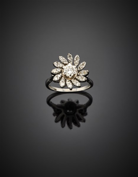 Anello a margherita in oro bianco con diamanti rotondi per complessivi ct. 0,70 circa, il centrale di ct. 0,35 circa, g 5,71 circa.