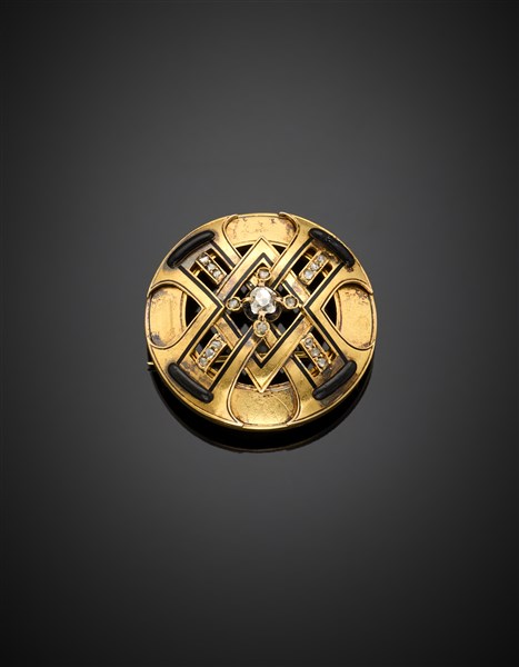 Rose cut diamond, onyx and enamel yellow gold brooch/pendant, g 13.20 circa, diam. cm 3.50 circa. (defects)