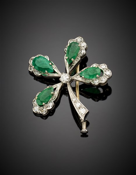 Spilla a quadrifoglio in oro bianco con smeraldi e diamanti, g 7,05 circa, lung