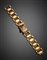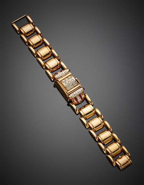 Orologio da polso da donna in oro rosso e bianco rifinito con diamanti, rubini calibré e cabochon, bracciale modulare, movimento n° 55 2725, g 44,68 circa, lungh. cm 17,30 circa. Quadrante e movimento firmati. (difetti e mancanze)