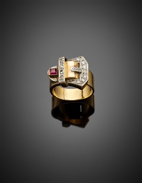 Anello a fibbia in oro rosso e bianco con diamanti e rubino carré, g 7,27 circa misura 15/55.