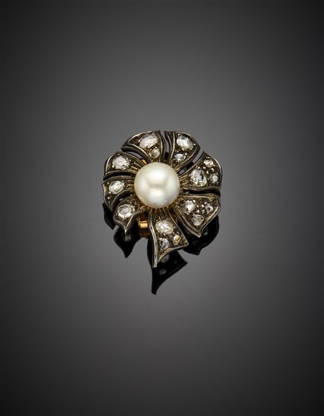 Silver and 12K gold , rose cut diamond earring centering a mm 8.50 circa pearl , g 6.91 circa, length cm 2.80 circa.