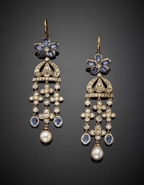 Orecchini pendenti in oro giallo e bianco con diamanti e zaffiri, terminati con due perle a goccia, g 20,85 circa, lungh. cm 7,80 circa.