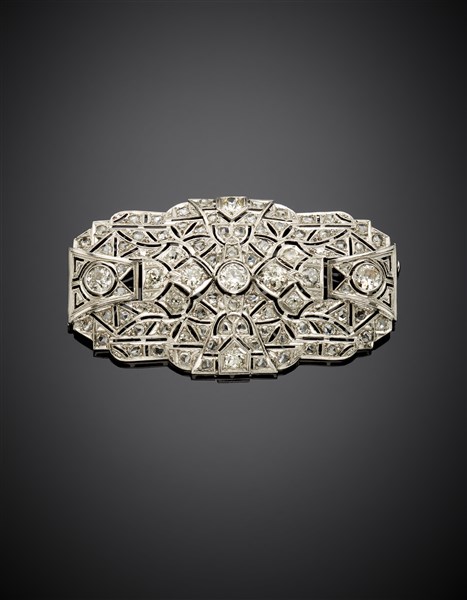 Spilla in oro bianco con diamanti rotondi, old mine e a mezza rosetta per complessivi ct. 3 circa g 17,22 circa, lungh. cm 6 circa.