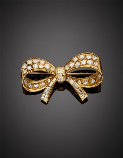 Spilla a fiocco in oro giallo con diamanti rotondi e tapered per complessivi ct. 3,50 circa, g 14,22 circa, largh. cm 4,90 circa.