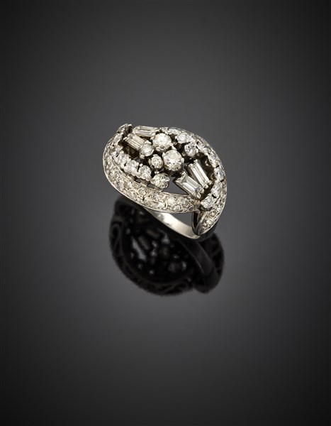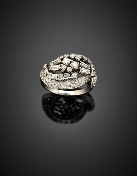 Anello in oro bianco con diamanti rotondi e baguette per complessivi ct. 1,30 c