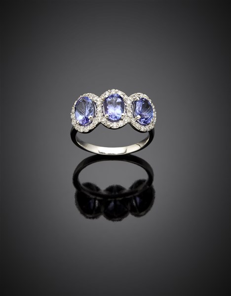 Anello in oro bianco con tre tanzaniti ovali per complessivi ct. 1,90 circa e diamanti rotondi a rifinirle per complessivi ct. 0,40 circa, g 4,94 circa misura 14/54.