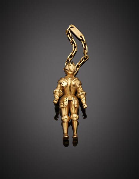 Portachiavi in oro giallo a guisa di armatura pendente, g 21,17 circa, lungh. cm 7 circa. Marcato 356 FI.