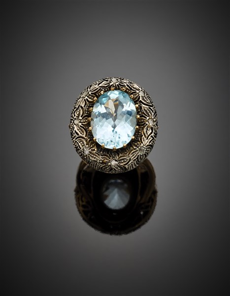 Anello in oro giallo 333/1000 e argento, al centro topazio azzurro ovale di ct. 10,20 circa, piccoli diamanti flat a rifinirlo, g 14,44 circa misura 18/58. (lievi difetti)
