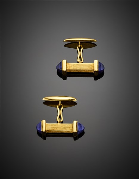 Gemelli in oro giallo satinato con lapislazzuli, g 10,32 circa.