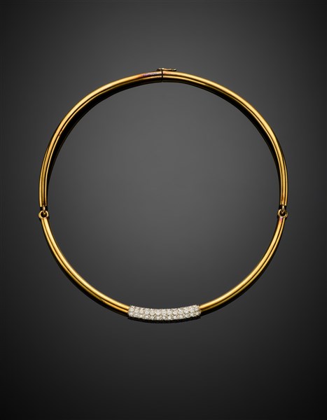 Collier rigido articolato in oro giallo e bianco con centrale in diamanti per complessivi ct. 1,80 circa, g 25,52 circa, diam. cm 11,70 circa.
