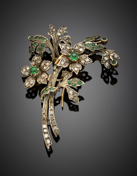 Spilla in oro 333/1000, argento, diamanti a mezza rosetta e smeraldi rotondi e cabochon con fiori "en tremblant", g 22,71 circa, lungh. cm 7,80 circa. (difetti)